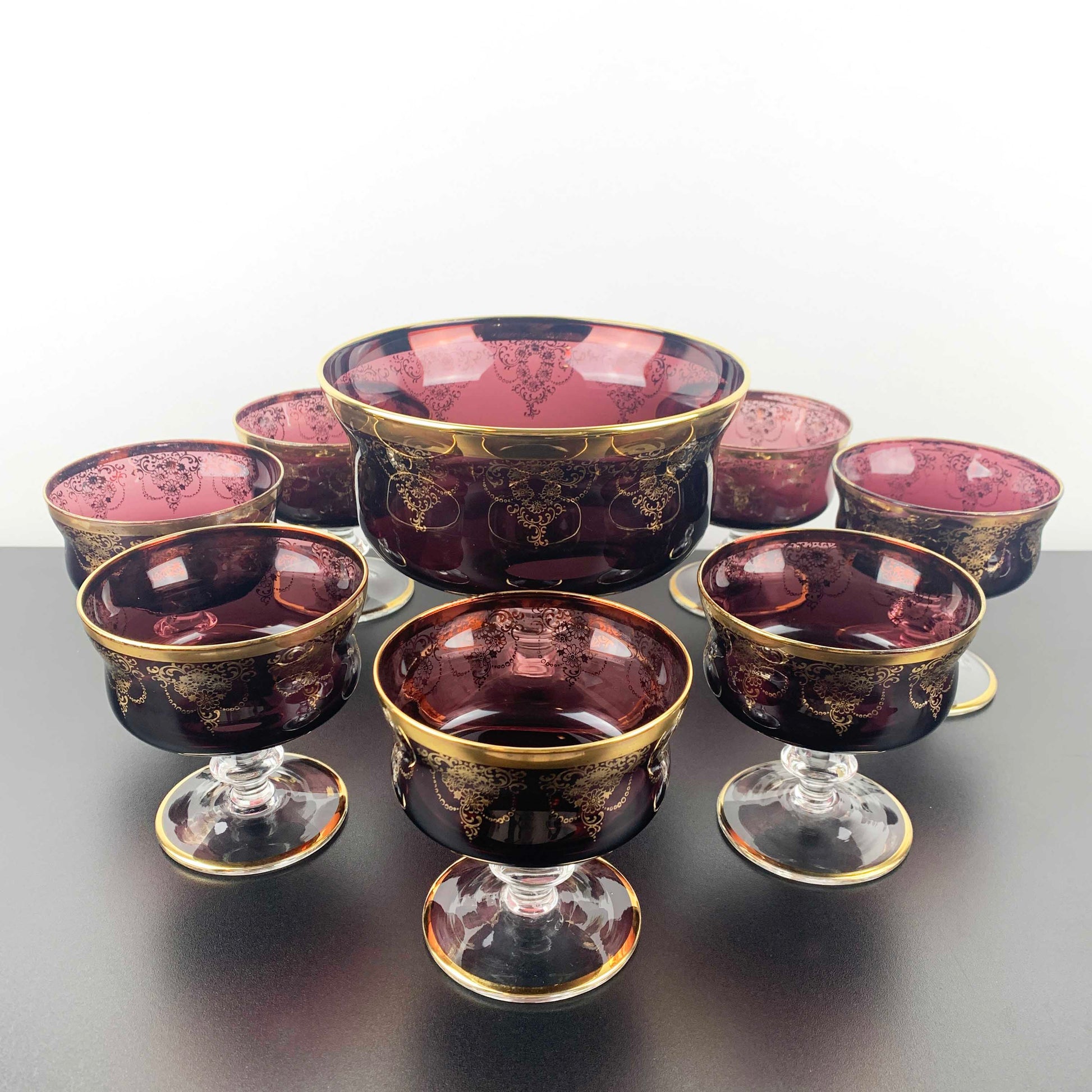 Featuring a stunning gold gilded filigree wraparound pattern and finished with gold trim to both the rim and clear glass base. In a rich amethyst coloured glass, this set is a testament to the fine makers of Murano.